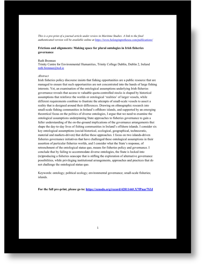 Windows of opportunity are open at this time of significant policy change that involves the development of a cohesive cross-Government Islands Policy and action plan for the offshore islands alongside the development of national and regional marine plans for the sound management of Ireland’s marine environment. These co-temporaneous processes provide an opportunity for the design and piloting of innovative governance initiatives for small-scale island fishing communities, that contribute towards meeting policy objectives at national, European and international scales.